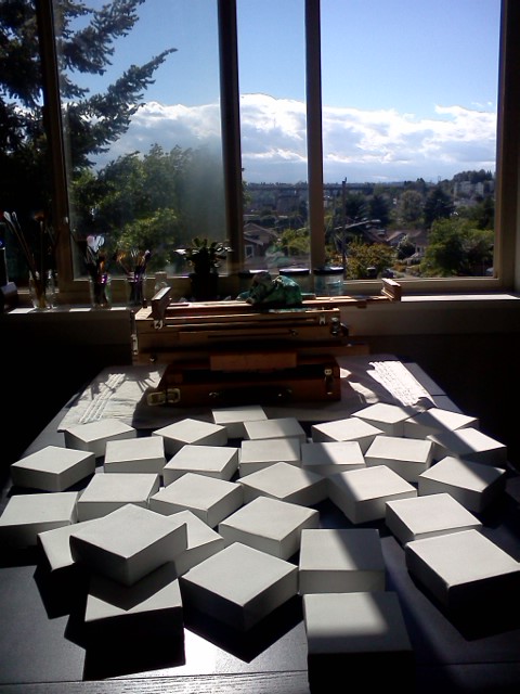Here they are, 30 blank 4"x 4" canvases on my table: