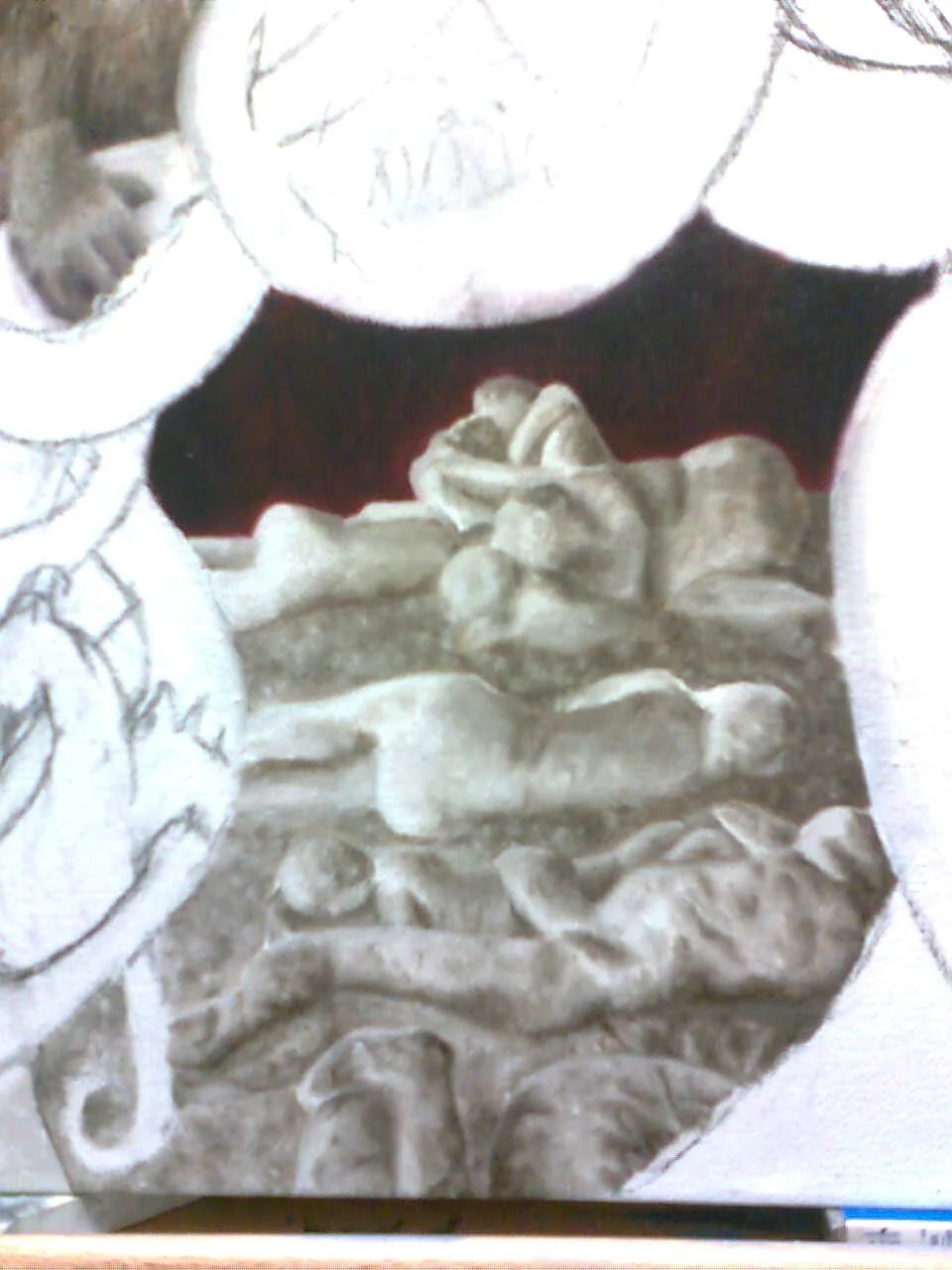 The figures, lacking color or detailed facial features, are simply human. There's a softness to the way they've collapsed, a lingering connection between each other in their last moments of experiencing life as themselves, that I like. They also represent for me, a sense of history; only we humans cling to our ancestors, seek out our roots, go digging to find out more about our past.