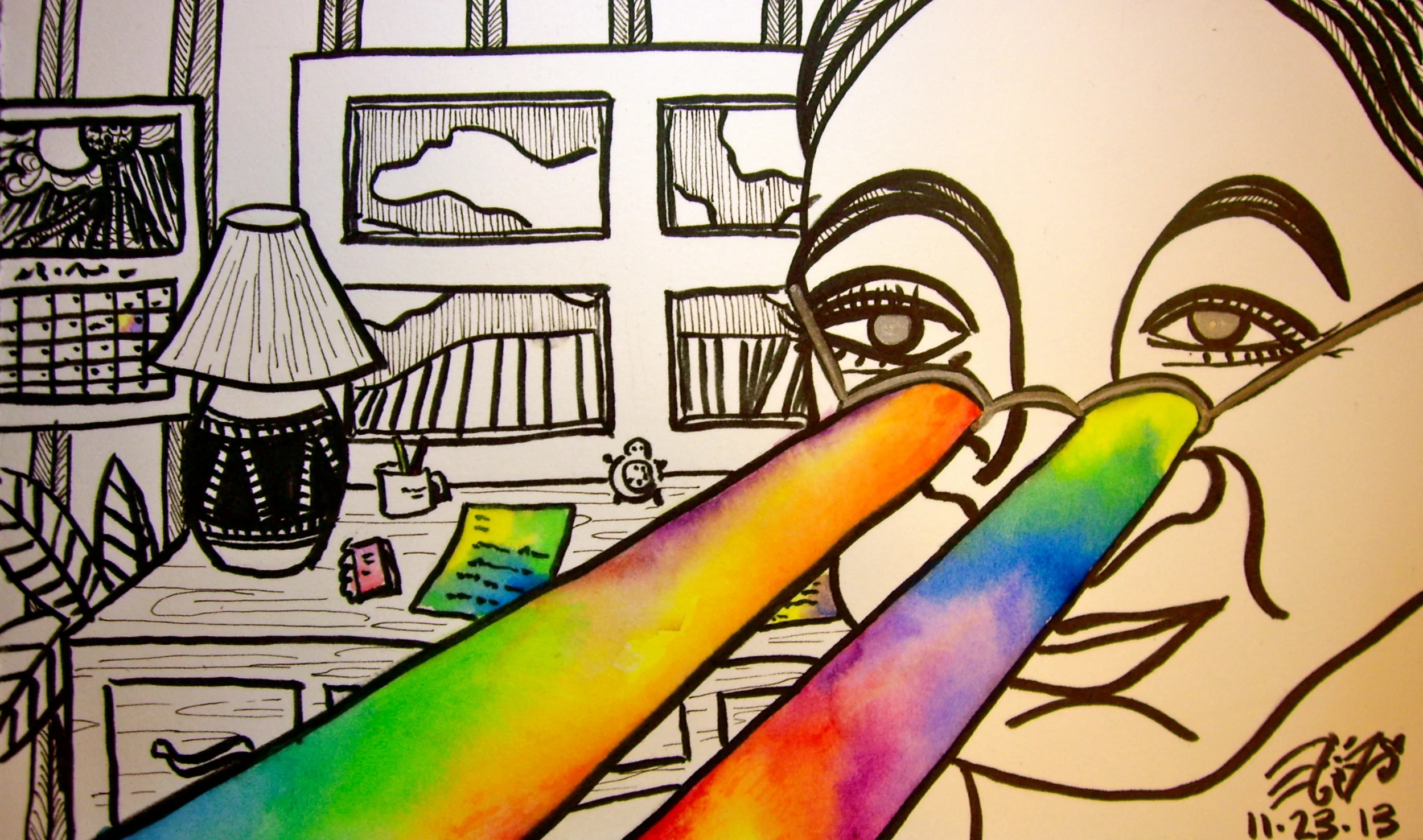 It started with a face, and it looked like the kind face of a good listener. I gave her some glasses, and magical rays shot out of them. It was still missing a setting; I looked into the upper left quadrant of the page, and I saw a writer's desk, so I doodled it into the background.