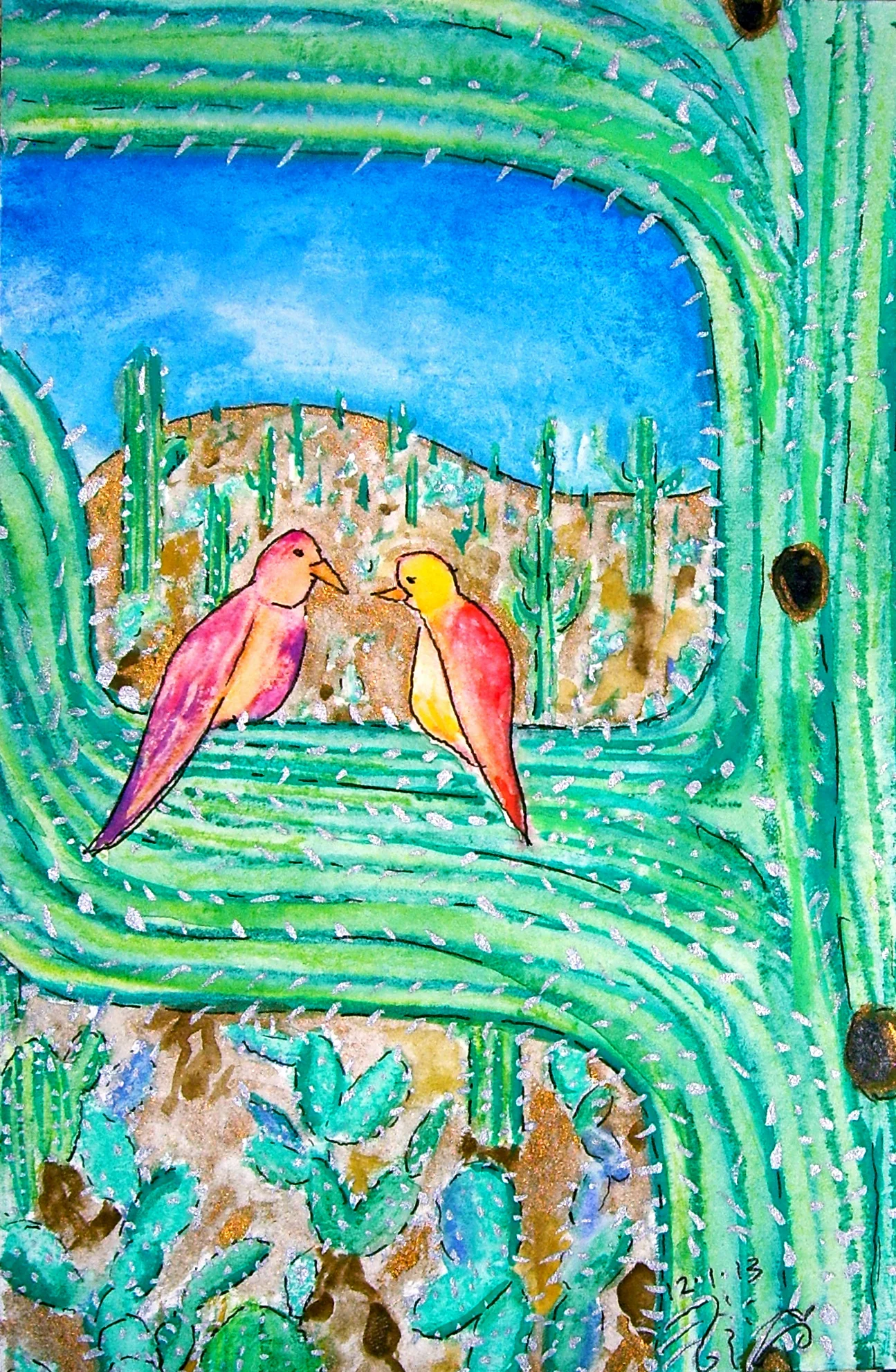 As I was walking through the Catalinas the other day, I noticed these two little birds far off on a saguaro branch, chatting away. Today, I doodled them into their own private penthouse, enjoying the desert paradise.