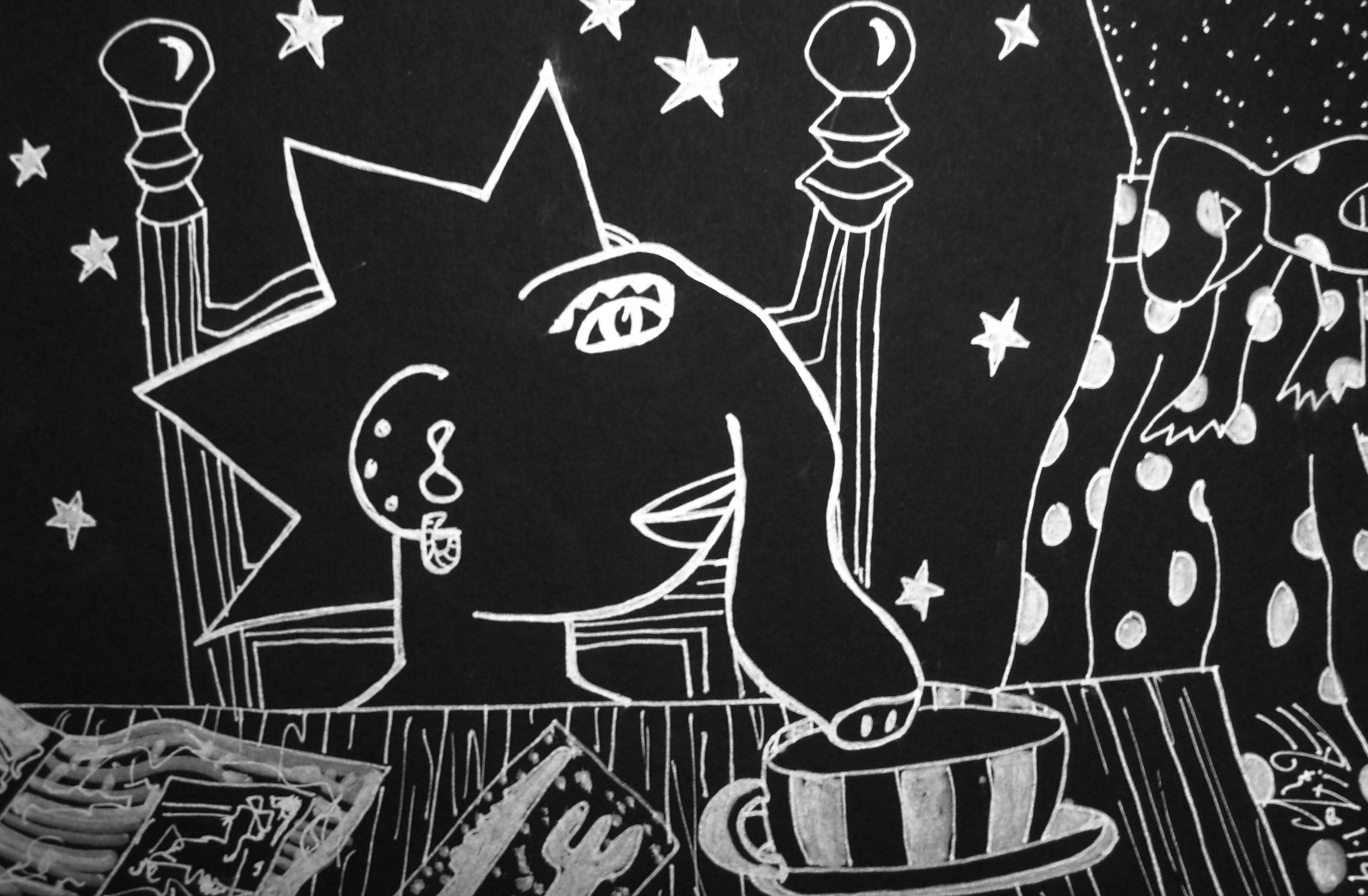 Not sure how these doodles fit together yet. This is the order I doodled them in, from left to right, but they may not be in chronological order. Definitely wondering how the scribblers will make sense of this!