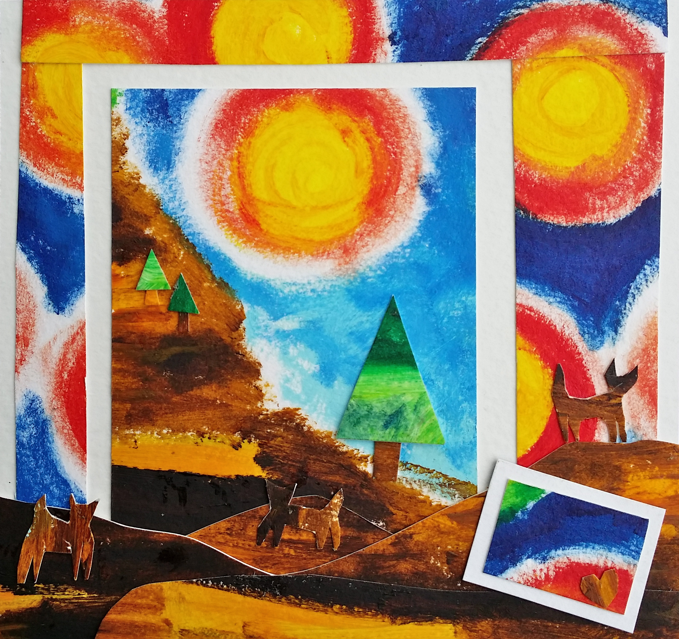 This is the second doodle made from a sheet of watercolor paper on which I used left over oil paints to doodle some colorful patterns. I imagine that there's a secret doorway somewhere in this canyon that a coyote's chorus could open at high noon. Where it leads, I don't know...